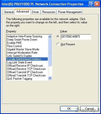 Dažnai (beveik visada) interneto tiekėjas prisiriša prie konkretaus kompiuterio ar maršrutizatoriaus, tad prijungus kitą kompiuterį prie ateinančio tiekėjo laido internetas neveikia. Taip yra todėl, kad tiekėjas fiksuoja pas save kompiuterio fizinį adresą – MAC adresą. Čia parodysime, kaip pasikeisti MAC adresą kompiuteryje su Windows XP operacine sistema. MAC address – Media Access Control address. Tai unikalus kompiuterio tinklo kortos adresas, kuris būna įrašytas gamykloje. Tačiau galite laikinai pasikeisti MAC adresą savo poreikiams. Pirma einate į Start -> Control panel -> Network Connections (Pradėti -> Valdymo skydas -> Tinklas). Susirandate savo tinklo kortos piktogramą. Ant jos paspaudžiate dešiniuoju pelės klavišu ir pasirenkate “Properties” (Ypatybės). Gausite tokį dialogo langą:
