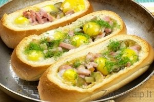 Ant bandelių viršaus įmuškite kiaušinius ir viską pašaukite į orkaitę 5-7 minutėm.